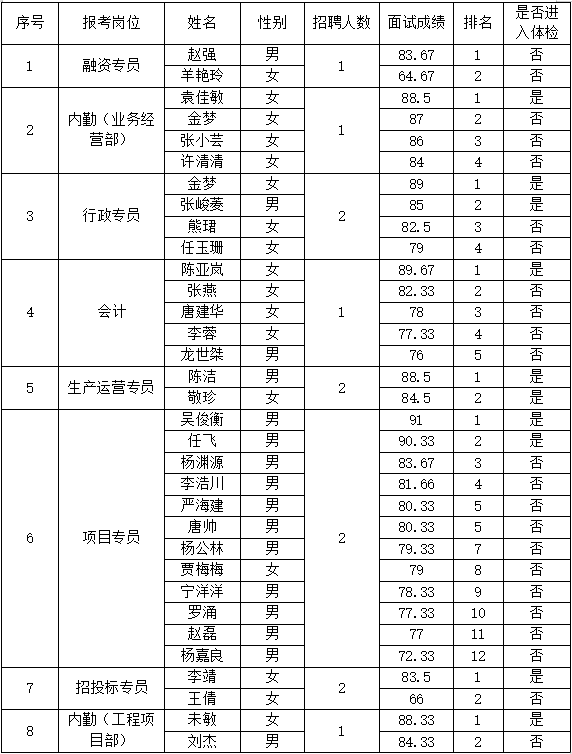 根據(jù)《綿陽安州礦產(chǎn)資源集團(tuán)有限公司公開招聘(智聯(lián))2022年度工作人員面試工作方案》相關(guān)規(guī)定,現(xiàn)將面試成績、排名及是否進(jìn)入體檢公示如下: